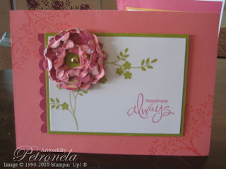 Hmmm Cameo Coral anyone! Well I think so, it co-ordinates with Raspberry Tart DSP (the flower) just 5 scallop circles with a brad inserted to keep it together then scrunched up. The branch is stamped (tone on tone) in the top left & bottom right corners of the card front. The flower Branch image is inked & then mounted in/onto Kiwi Kiss with a little Rose Red Scalloped piece behind that as well, to tie in the Raspberry Tart DSP used for the Flower. The Sentiment is from "Whimsical Words" SAB.